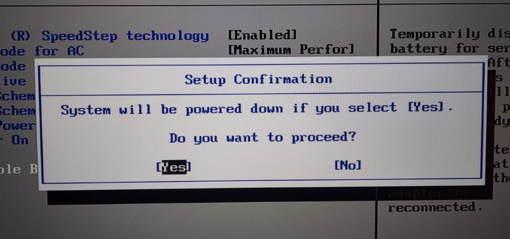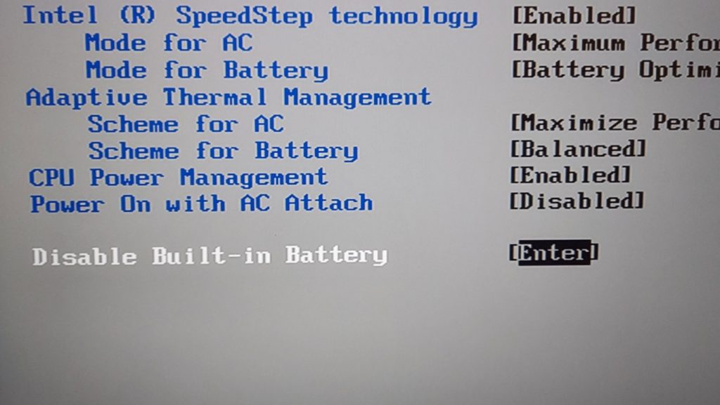 分解の前にまずはBIOSの設定から Config→Power の中にある Disable built-in battery で Enter を選択する。すると自動的に電源が切れ,内部バッテリがオフになる(次にAC電源に繋いだときまで電源がつかなくなる)。